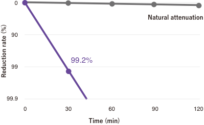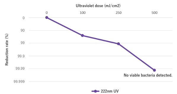- *2Mold solution (0.5 mL) was dropped onto plastic dishes, and irradiation experiments were conducted using ultraviolet light with a wavelength of 222 nm and irradiation dosages of 100, 250, and 500 mJ/cm2. After ultraviolet irradiation, the bacterial solution was applied to agar medium and incubated at 25°C for 72 hours. The number of colonies was then counted to evaluate the disinfection effect. The attenuation rates (N=2) was plotted. References are as follows.