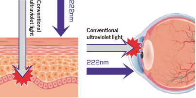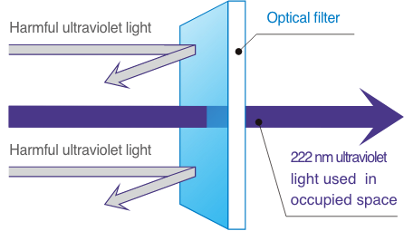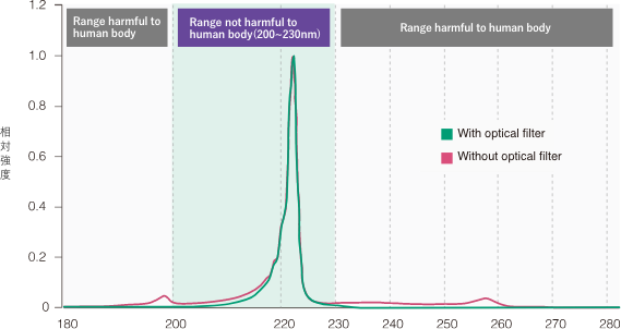 By combining an excimer lamp with a peak wavelength of 222 nm and a special optical filter, all wavelengths above 230 nm (which are harmful to humans) are blocked.