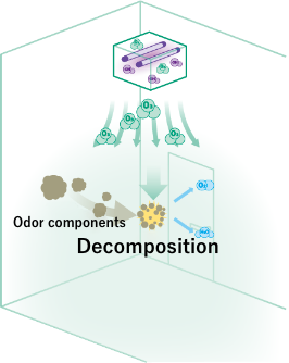 By using an excimer lamp with a peak wavelength of 172 nm as the light source, ozone production equivalent to discharge ozone generation is possible without emission of nitrogen oxides (NOx). The 172 nm ultraviolet light and reactive oxygen species (e.g., ozone) enable deodorization※1, disinfection※1, TOC reduction, and chemical decomposition※2.