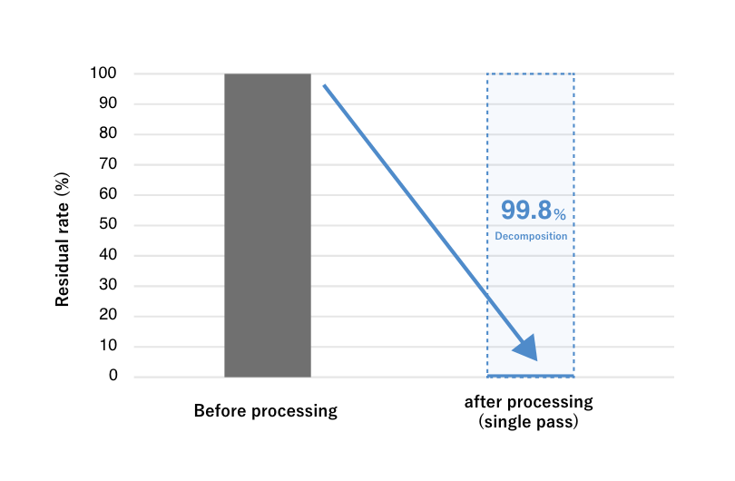 By using an excimer lamp with a peak wavelength of 172 nm as the light source, ozone production equivalent to discharge ozone generation is possible without emission of nitrogen oxides (NOx). The 172 nm ultraviolet light and reactive oxygen species (e.g., ozone) enable deodorization※1, disinfection※1, TOC reduction, and chemical decomposition※2.