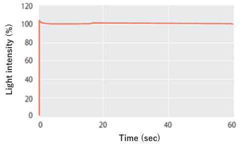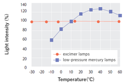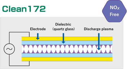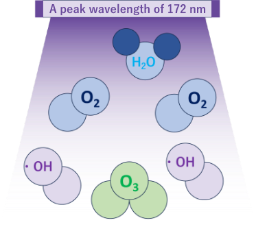 By using an excimer lamp with a peak wavelength of 172 nm as the light source, ozone production equivalent to discharge ozone generation is possible without emission of nitrogen oxides (NOx). The 172 nm ultraviolet light and reactive oxygen species (e.g., ozone) enable deodorization※1, disinfection※1, TOC reduction, and chemical decomposition※2.