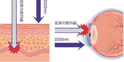波長222nmの紫外線は角質層や目の角膜で吸収されるため、日焼けや皮膚ガン、白内障といった障害を引き起こしません。
