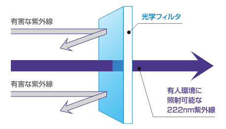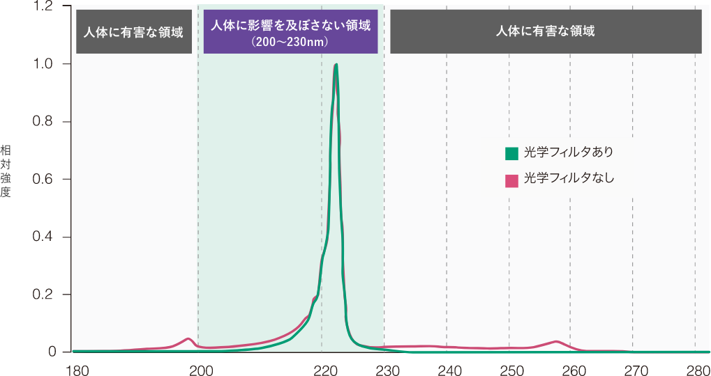 波長222nmをピークに持つエキシマランプに特殊な光学フィルタを組み合わせることで、ヒトに悪影響を及ぼす230nm以上の波長をカットします。