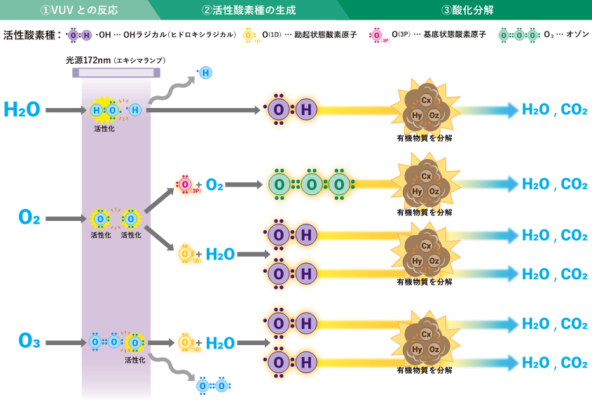 172nmの光とその光によって生成される活性酸素によってニオイなどの有機物質の分子結合を強力に酸化分解します