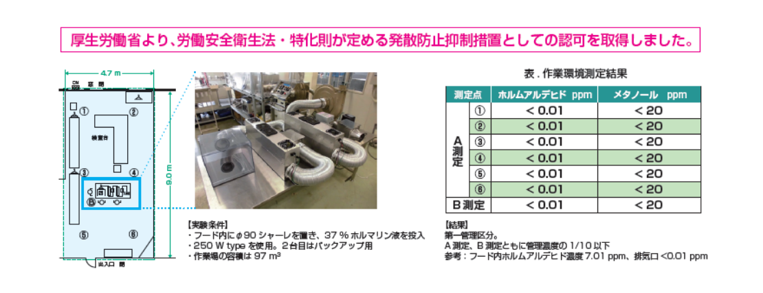Clean172 オゾン生成用UV光源によるホルムアルデヒドの分解・除去技術を発散防止抑制措置として応用しました。厚生労働省より、労働安全衛生法・特化則が定める発散防止抑制措置としての認可を取得しました。